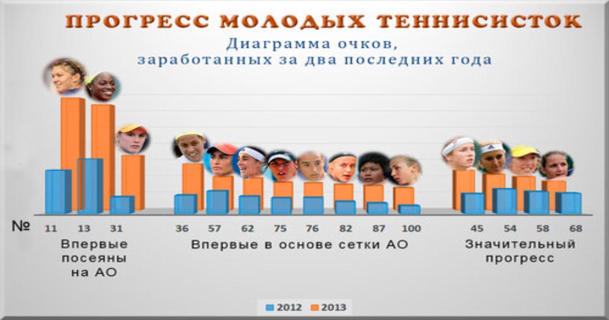 В прошлом сезоне блог «Спагетти» усердно пичкал вас молодой порослью WTA, и сейчас продолжает свое черное дело. Посмотрите на диаграмму ниже. Я отобрала 15 молодых теннисисток, заявленных в основную сетку Открытого чемпионата Австралии, которые достигли наибольшего прогресса в прошлом сезоне по очкам. Обратите внимание, что высота столбиков – это количество очков за позапрошлый и прошлый сезоны, а не рейтинг.