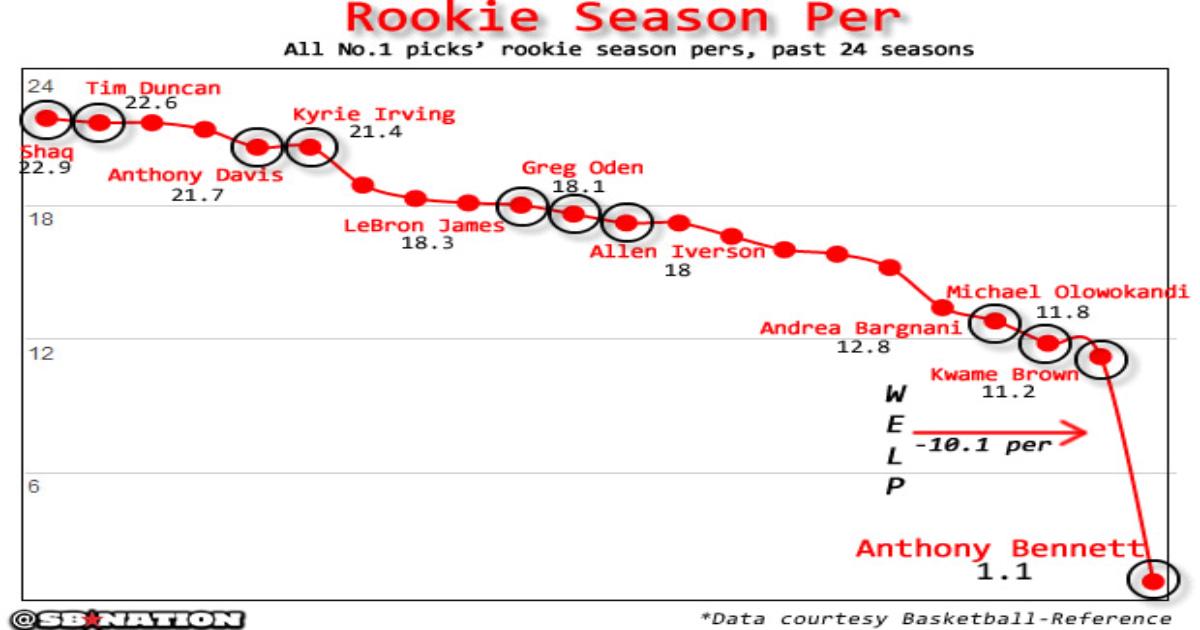 Статистическая таблица от SBNation, которая показывает, как выступали первые номера драфта в свой первый сезон в НБА. Таблица охватывает 24 сезона. N1 драфта этого сезона Энтони Беннетт пока бьет антирекорд, который другим игрокам будет крайне сложно превзойти: рейтинг эффективности всего 1,1. Справедливости ради отмечу, что в случае с Беннеттом имели место быть травмы.
