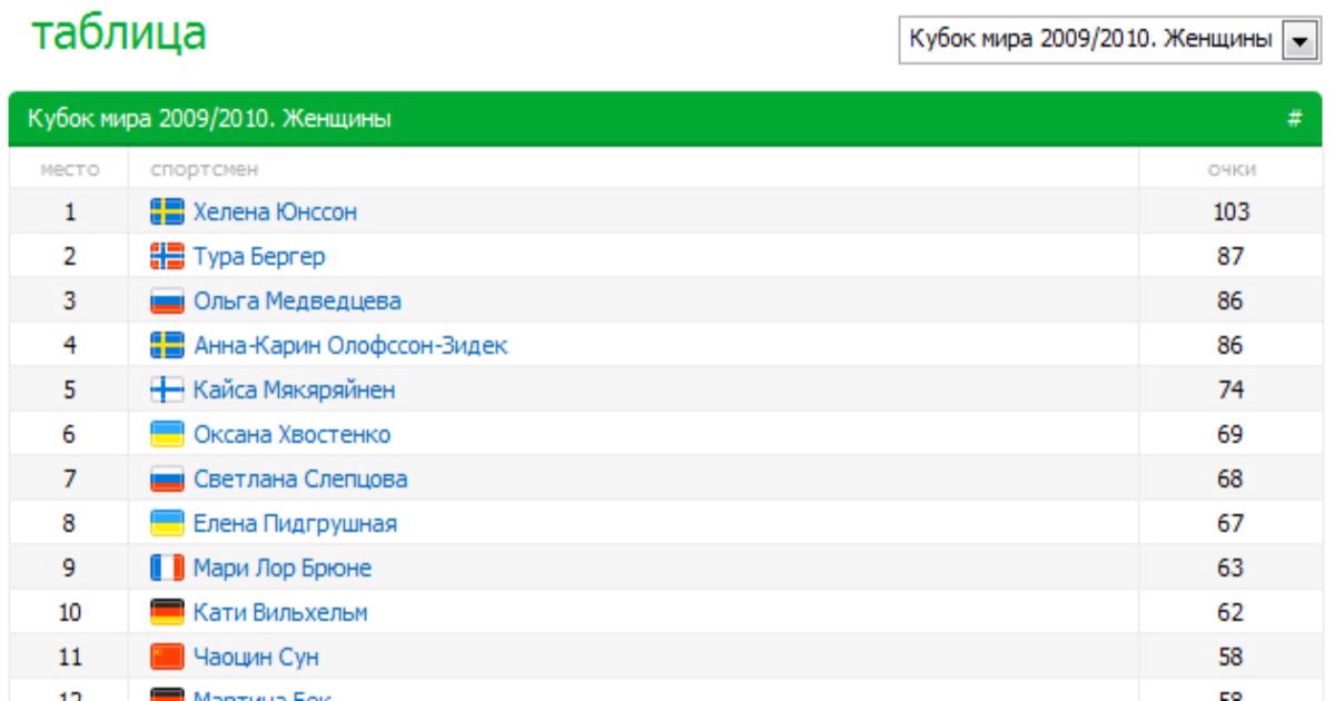 Кубок мира: новые вкладки «Таблица» и «Календарь». Теперь Вы в любой момент сможете узнать место Вашего любимого спортсмена (или спортсменки) в общем зачете, а также ознакомиться с полным календарем биатлонного сезона 2009/2010 (и перейти на страницы онлайнов интересующих Вас гонок не забывайте, что каждая гонка комментируется нашими журналистами и... Вами в онлайн-чате).
