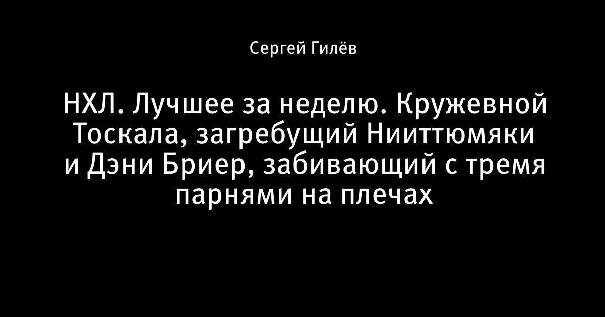 16 декабря 2009, 04:30 НХЛ. Лучшее за неделю. Кружевной Тоскала, загребущий Нииттюмяки и Дэни Бриер, забивающий с тремя парнями на плечах Лучшие силовые приемы. Лучшие сэйвы. Лучшие голы. Лучшие моменты недели. Автор Сергей Гилёв Этот пост опубликован в блоге на Трибуне Sports.ru. Присоединяйтесь к крупнейшему сообществу спортивных болельщиков! Другие посты блога Айс-ТВ