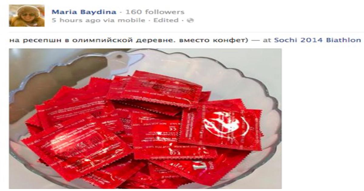 Пресс-атташе Союза биатлонистов России Мария Байдина показывает, чем угощают на ресепшн в олимпийской деревне.