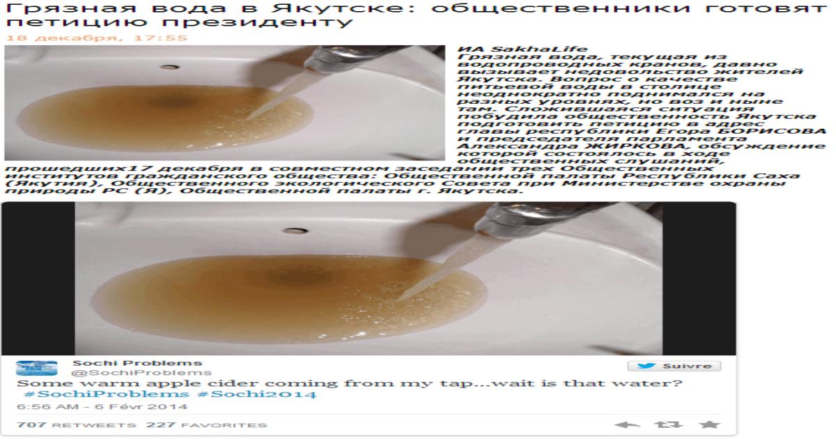 Слишком многого хотите от страны, и олимпиаду вам подавай и универсиаду и чемпионат мира по футболу, бюджет то не резиновый, водички прозрачной им захотелось, может вам еще и дороги отремонтировать или больничку современную построить в городе, чтоб вы туда по полису ходили лечиться? совсем уже