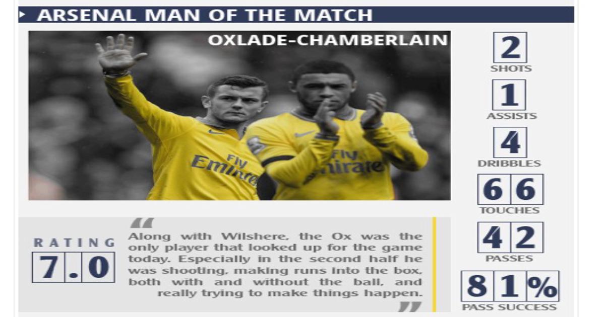 Вместе с Уилширом, Окс оказался единственным игроком, который был настроен на матч. Особенно во втором тайме он бил по воротам, прорывался в штрафную – с мячом и без мяча – и действительно хотел добиться результата.