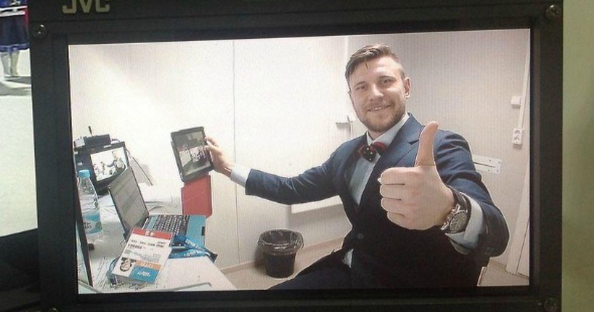 Дмитрий Шнякин: «А вот монитор, на который выходит картинка с этой камеры. Сверху – пульт. Картинку можно корректировать – цвет, четкость, яркость. Просто и очень удобно. Мой вид пусть вас не смущает – это ради женщин. Они впервые прыгали на Олимпиадах».