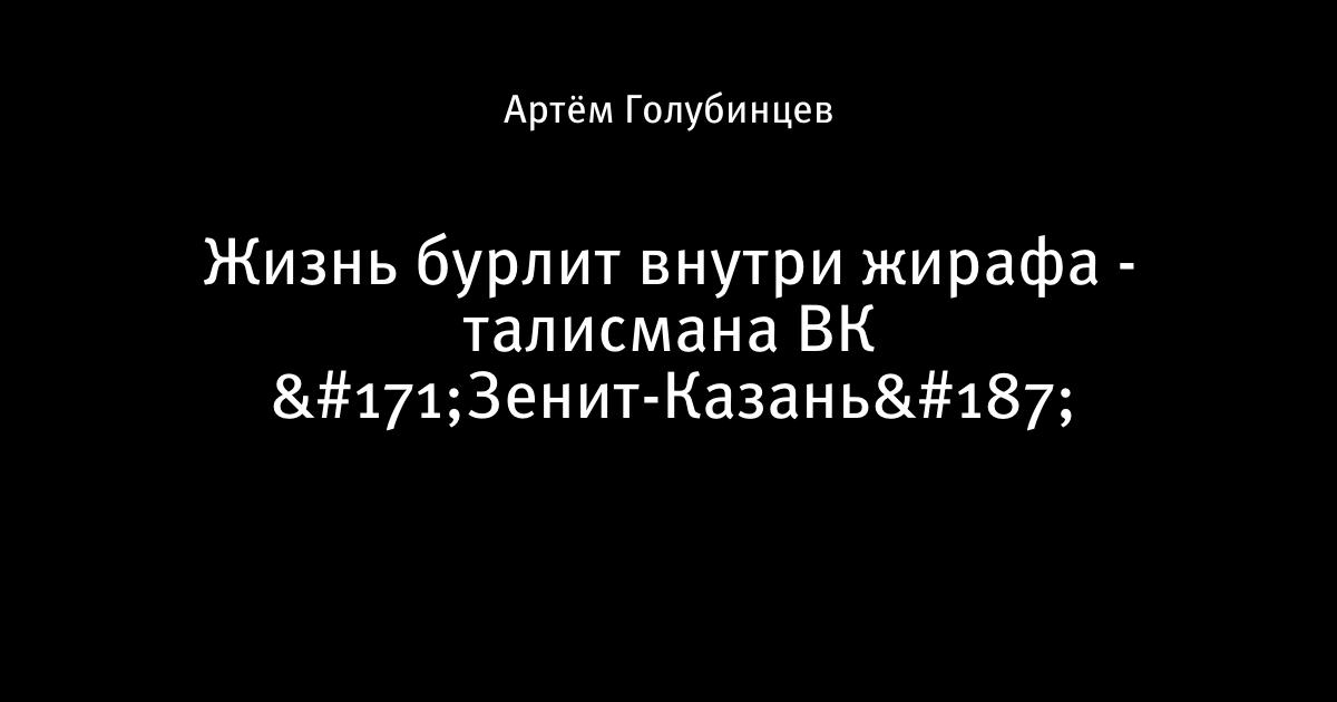 20 февраля 2014, 18:03 Жизнь бурлит внутри жирафа - талисмана ВК «Зенит-Казань» Источник Автор Артём Голубинцев Этот пост опубликован в блоге на Трибуне Sports.ru. Присоединяйтесь к крупнейшему сообществу спортивных болельщиков! Другие посты блога Телевизор 3.0 Зенит-Казань