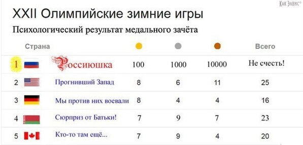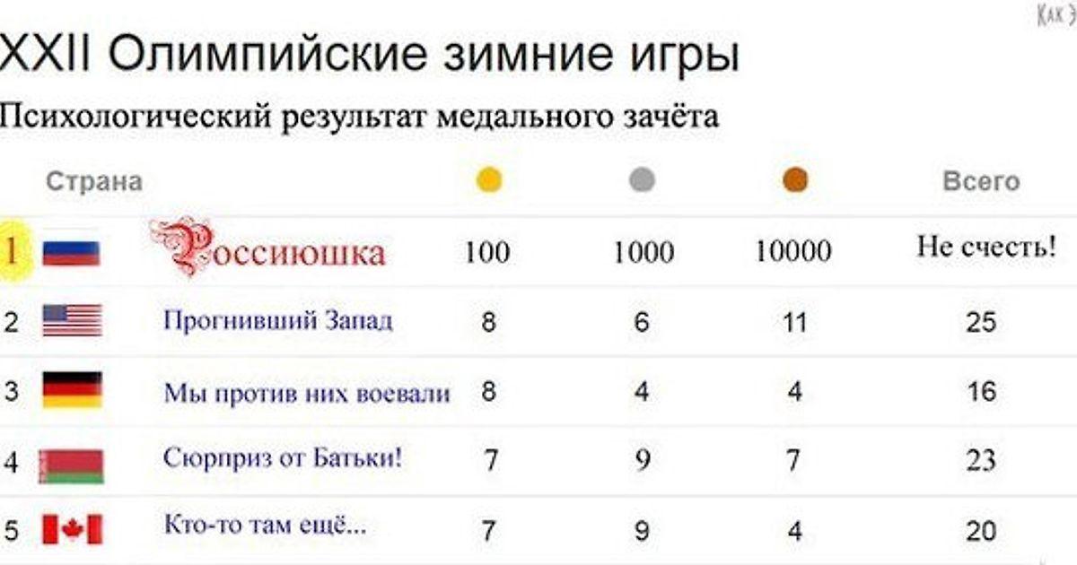 22 февраля 2014, 13:35 Альтернативный медальный зачет Олимпиады-2014 Автор tribuna.sports.ru Этот пост опубликован в блоге на Трибуне Sports.ru. Присоединяйтесь к крупнейшему сообществу спортивных болельщиков! Другие посты блога Россия-2025