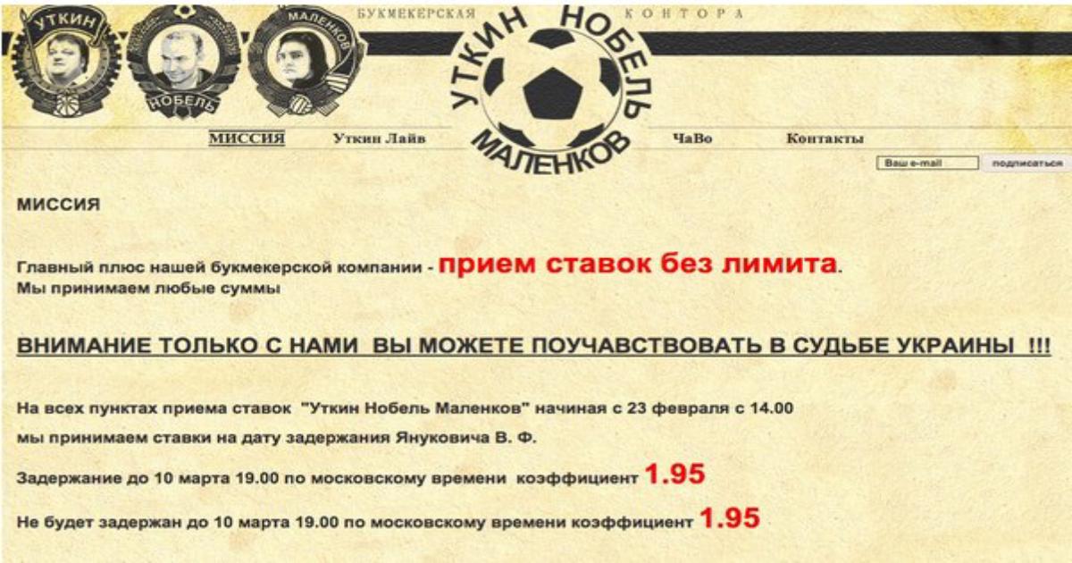 23 февраля 2014, 15:28 В букмекерской конторе Василия Уткина можно поставить на время ареста Януковича Не только спорт. Вот в некоторых конторах можно на Януковиче заработать. Автор Сергей Гилёв Этот пост опубликован в блоге на Трибуне Sports.ru. Присоединяйтесь к крупнейшему сообществу спортивных болельщиков! Другие посты блога Фора ноль Бонусы букмекеров Рейтинг букмекеров Букмекеры Зарубежные букмекеры Виктор Янукович Ставки на спорт