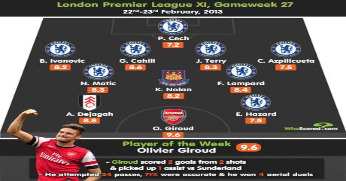 Французский форвард "Арсенала" Оливье Жиру признан лучшим игроком (из лондонских клубов) минувшего уик-энда в Английской Премьер-лиге, получив оценку 9.6.