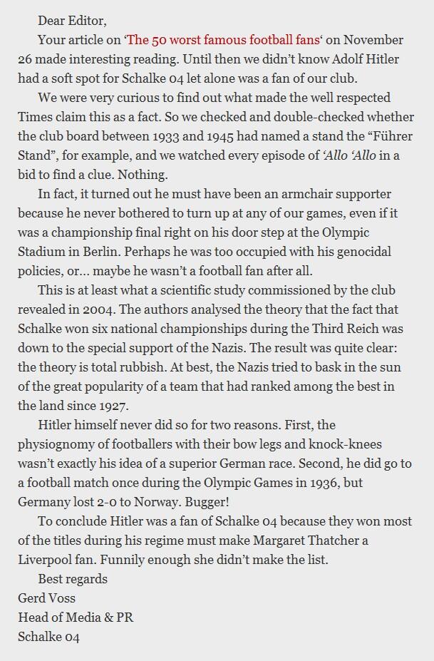 Все подозрения о том, что Гитлер болел за «Шальке», отмела пресс-служба гельзенкирхенского клуба (а именно руководитель «Шальке 04» по связям с общественностью и СМИ Герд Фосс) в обращении к английскому изданию The Times. Написано это обращение было в ответ на статью «50 худших известных футбольных болельщиков» от 2008 года.
