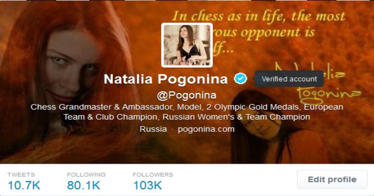 Спустя почти 5 лет твитов, свыше 100 000 подписчиков и 86 эпизодов "Шахматной недели в Твиттере" Наталья Погонина наконец-то получила "галочку" в Твиттере.
