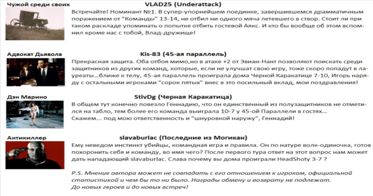 Вашему вниманию поверхностный взгляд на ваши индивидуальные успехи в прошедшем туре. Порадуемся за наших героев вместе! Для удобства восприятия я отмечу понравившегося мне игрока в каждом амплуа, а лучшего плохиша тура выбирайте сами.