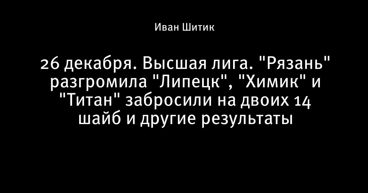 26 декабря. Высшая лига. "Рязань" разгромила "Липецк", "Химик" и "Титан" забросили на двоих 14 шайб и другие результаты