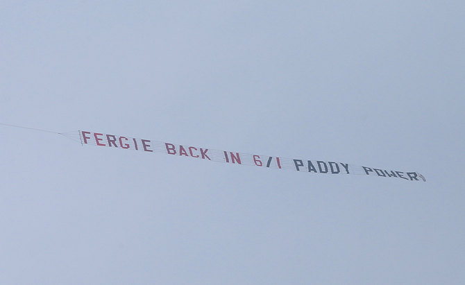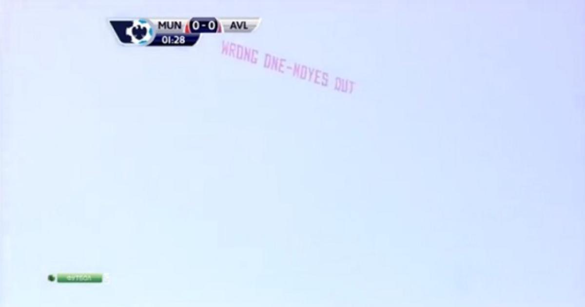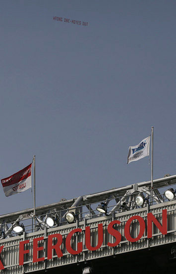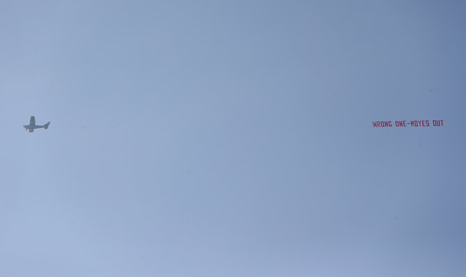 Баннер «Wrong One – Moyes Out» над стадионом Олд Траффорд