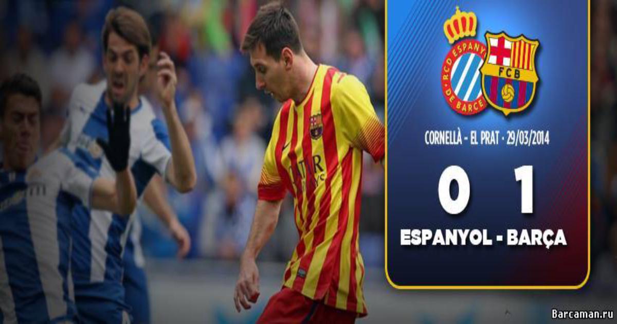 Эспаньол — Барселона 0:1Голы: Месси, 77 (с пенальти).Эспаньол: Касилья — Хави Лопес, Колотто, Морено (Сидней, 49), Фуэнтес — Давид Лопес, Виктор Санчес — Симау (Кордоба, 78), Пицци (Алекс, 66), Стуани — Серхио Гарсия. Барселона: Пинто — Дани Алвеш, Пике, Маскерано, Альба — Бускетс, Хави, Фабрегас (Серхи Роберто, 90) — Неймар (Санчес, 81), Педро (Иньеста, 79), Месси.Предупреждения: Стуани, Колотто, Хави Лопес, Виктор Санчес — Бускетс.Удаление: Касилья, 83.