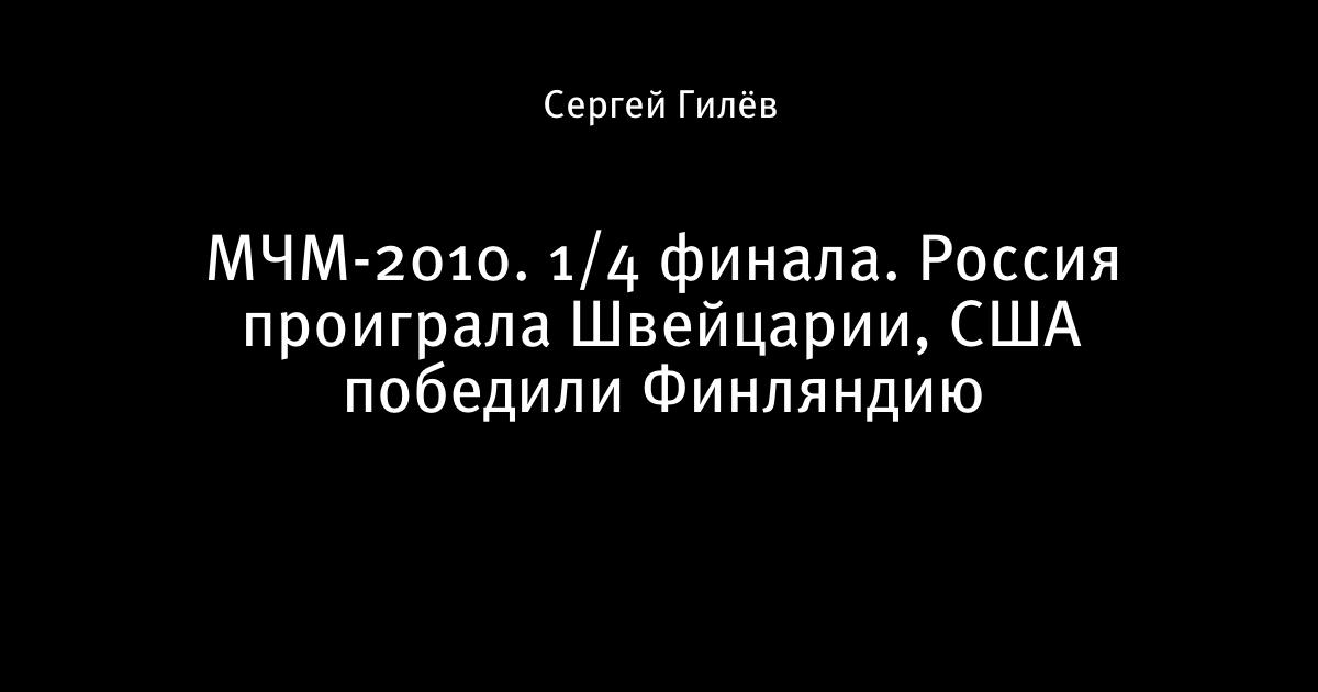 3 января 2010, 11:02 МЧМ-2010. 1/4 финала. Россия проиграла Швейцарии, США победили Финляндию Россия Швейцария 2:3 США Финляндия 6:2 Автор Сергей Гилёв Этот пост опубликован в блоге на Трибуне Sports.ru. Присоединяйтесь к крупнейшему сообществу спортивных болельщиков! Другие посты блога Айс-ТВ
