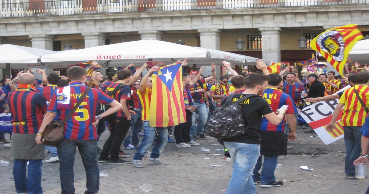 Увертюра к самому футболу началась за несколько часов до матча, когда на Plaza Mayor собралось немного побуянить и попеть песни около сотни – полутора «кулес». Заботливо окруженные отрядом полиции, для их же собственной безопасности, гости столицы в сине-гранатовых и желто-красных футболках пили пиво, жгли файеры и сотрясали окружающие их стены противоречивыми текстами – традиционные, а в этой обстановке особенно колоритные, «puta Real Madrid», «puta Espana», «inda-inda-independencia» звучали даже чаще гимна «Барсы». Какой уважающий себя каталонец откажет себе в удовольствии пройтись по центральным улицам Мадрида, посылая по матушке все испанское? Предоставив толпе выплеснуть первую часть эмоций, полиция быстро соорудила широкий коридор и отправила ее организованным строем в сторону стадиона. Меня, сознательно не поехавшего на метро, а решившего изучить пеший маршрут, толпа повлекла за собой.