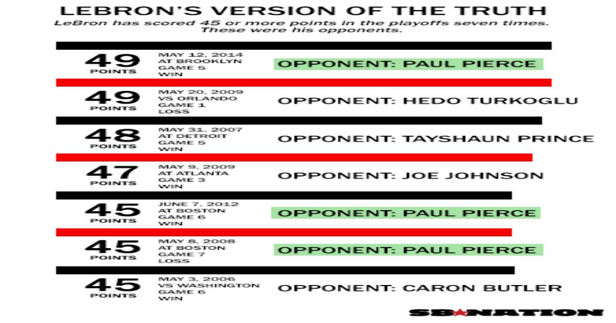 в 2008 году на 45 очков леброна пирс ответил 41 очками и бостон тот матч выиграл.