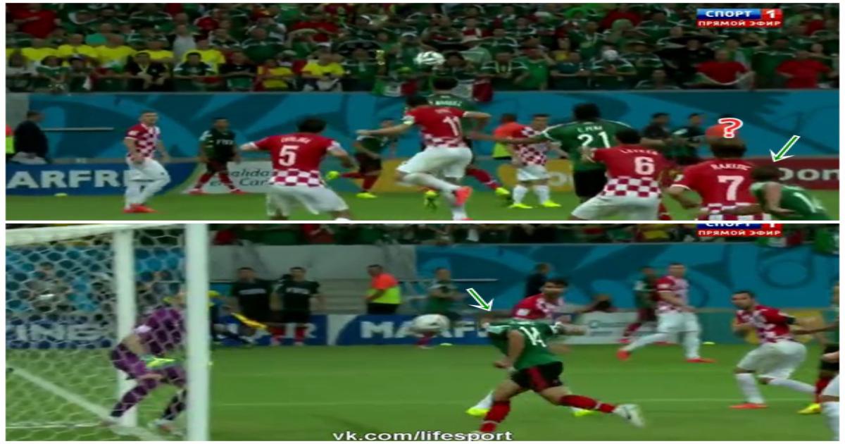 В этом моменте все было разыграно как по учебнику. Маркес переигрывает большого воздушного аса Марио Манджукича, обратите внимание на действия Чорлуки под знаком вопроса на среднем фото - он как будто подмышки решил почесать. Чичарито со всех ног бежит на дальнюю штангу, а распиаренный Иван Ракитич (под знаком вопроса на нижнем фото) демонстрирует давнишнее правило - яркий атакующий игрок при обороне собственных ворот не полезнее штанги. Все внимание на мяче, а то, что подлый мексикашка твои задние карманы обчистил, не заметил. Не спешу возносить до небес Рафу Маркеса - его звездный час пробьет в игре с голландцами. Но до него еще доберемся.