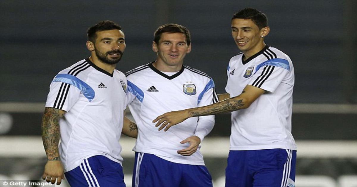 Все готовы: Лионель Месси на тренировке в субботу вместе с Эсекиэлем Лавесси и и Анхелем Ди Мария.