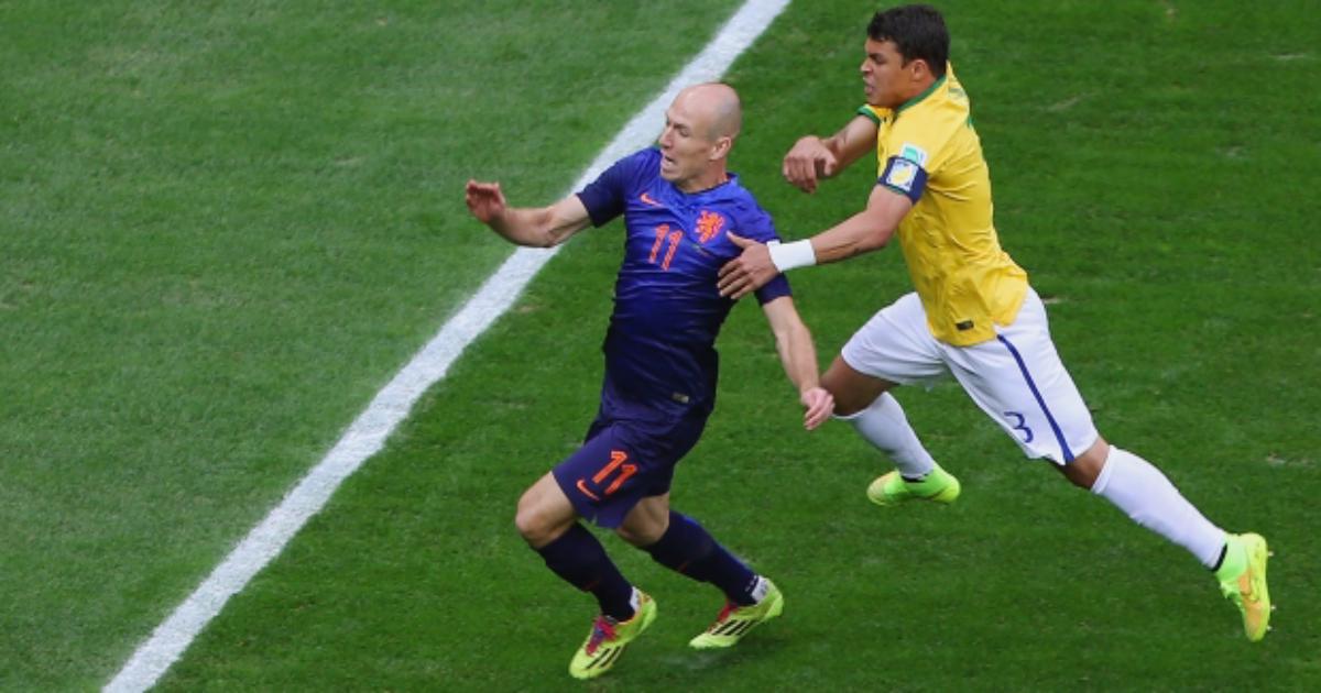 Сомнений в том, что Тьяго Силва дёрнул за плечо Арьена Роббена, не было, только вот повторы наглядно продемонстрировали истинное место нарушения правил. Фол был в метре от штрафной! В то же время Тьяго Силва заслуживал прямой красной карточки, а Бразилия – опаснейший штрафной.