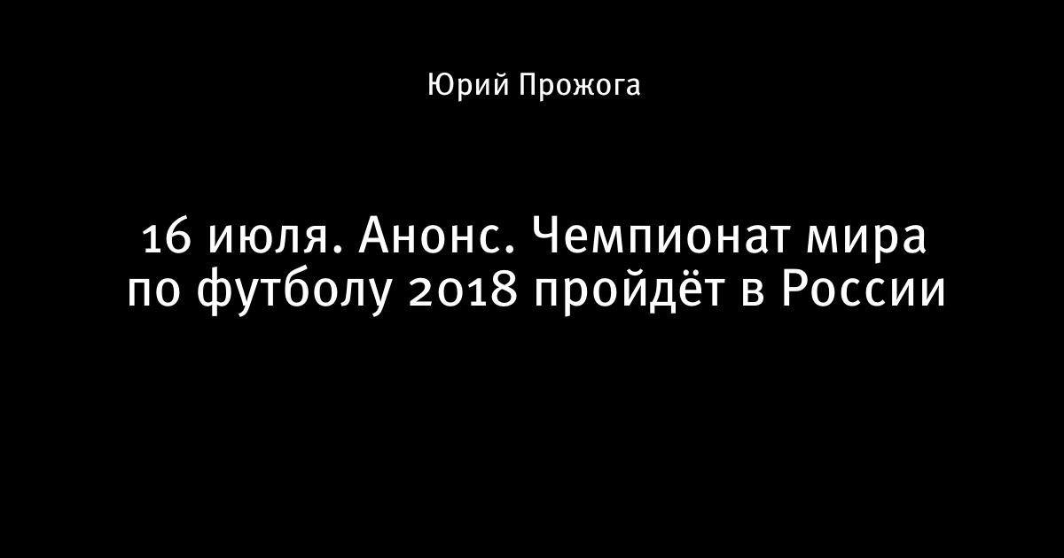 16 июля 2014, 10:55 16 июля. Анонс. Чемпионат мира по футболу 2018 пройдёт в России Автор Юрий Прожога Этот пост опубликован в блоге на Трибуне Sports.ru. Присоединяйтесь к крупнейшему сообществу спортивных болельщиков! Другие посты блога Рисую спорт ЧМ-2018 FIFA