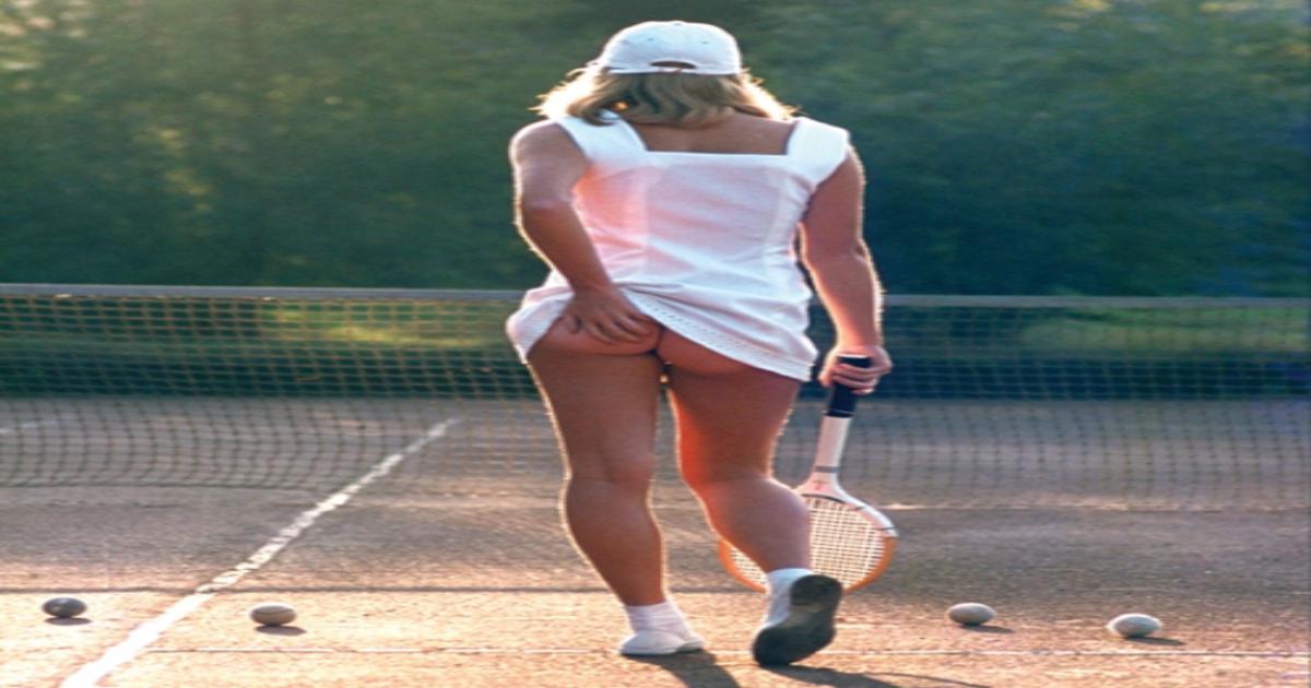 Культовая фотография, на которой запечатлена молодая женщина на теннисном корте. Правой рукой она держит ракетку, а левой приподнимает сзади платье, показывая, что она без нижнего белья.