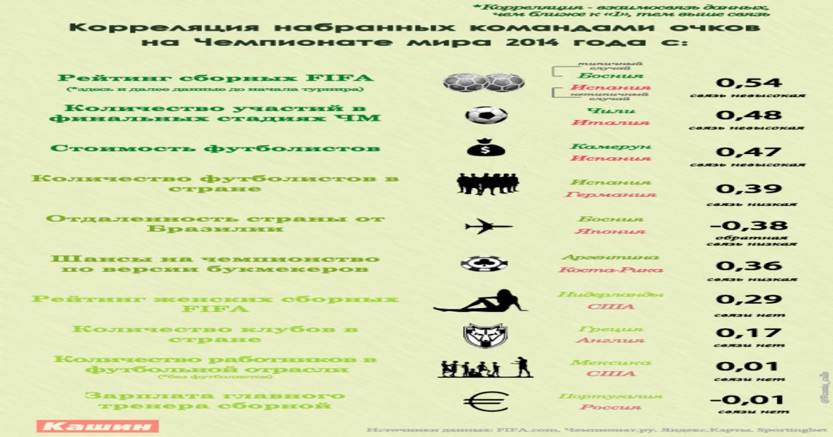 Чемпионат мира по футболу в Бразилии по результатам стал не очень предсказуемым. Это подтверждается корреляцией, связью, разных данных с набранными сборными очками на турнире (за матчи плей-офф очки начислялись по обычной системе).