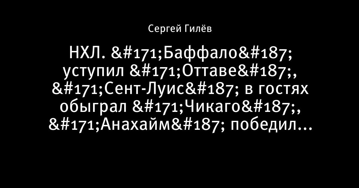 4 февраля 2010, 16:03 НХЛ. «Баффало» уступил «Оттаве», «Сент-Луис» в гостях обыграл «Чикаго», «Анахайм» победил «Детройт» Баффало Оттава 2:4 (0:0, 0:1, 2:3) Чикаго Сент-Луис 2:3 (1:0, 0:3, 1:0) Калгари Каролина 4:1 (1:0, 2:1, 1:0) Эдмонтон Филадельфия 1:0 (0:0, 0:0, 1:0) Анахайм Детройт 3:1 (2:0, 1:1, 0:0) Автор Сергей Гилёв Этот пост опубликован в блоге на Трибуне Sports.ru. Присоединяйтесь к крупнейшему сообществу спортивных болельщиков! Другие посты блога Айс-ТВ