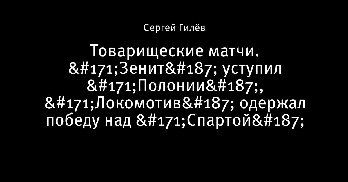 9 февраля 2010, 15:49 Товарищеские матчи. «Зенит» уступил «Полонии», «Локомотив» одержал победу над «Спартой» Зенит Россия Полония Польша 0:1 0:1 Межеевски (24) Локомотив Россия Спарта Прага Чехия 1:0 1:0 Траоре (14) Автор Сергей Гилёв Этот пост опубликован в блоге на Трибуне Sports.ru. Присоединяйтесь к крупнейшему сообществу спортивных болельщиков! Другие посты блога Разборки в олимпийском Париже
