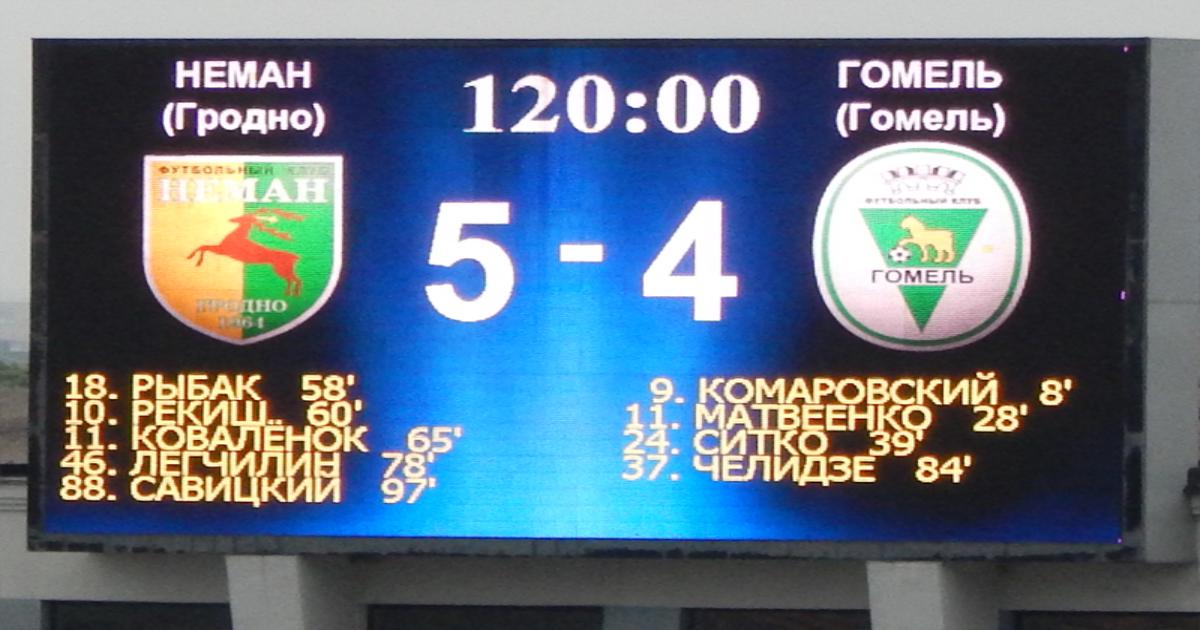 ГОЛЫ: 0:1 - Комаровский (8), 0:2 - Матвеенко (28), 0:3 - Ситко (39), 1:3 - Рыбак (58), 2:3 - Рекиш (60), 3:3 - Ковалёнок (65), 4:3 - Легчилин (78), 4:4 - Челидзе (84), 5:4 - Савицкий (97).