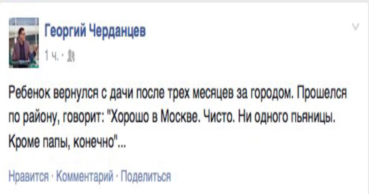Sergey Y. Черданцеву плюс за пост, и минус за палево перед ребенком. Аккуратнее надо быть - и бухать в специально отведенных местах, на работе, например)) 29 августа 2014, 17:37 +82 Ответить