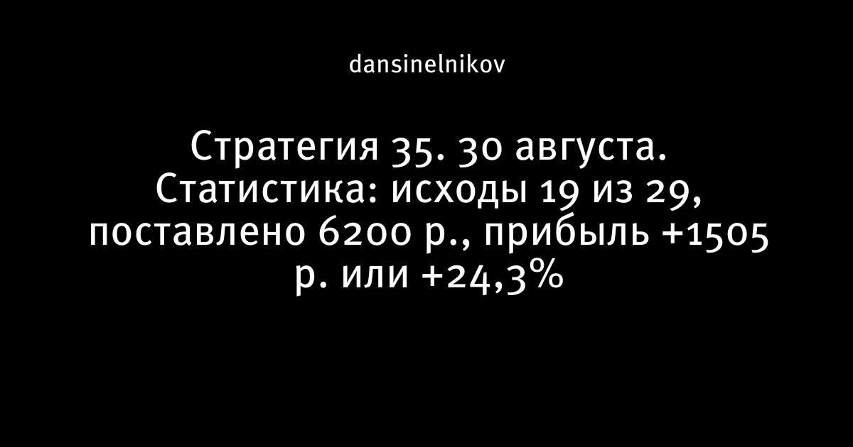 Стратегия 35. 30 августа. Статистика: исходы 19 из 29, поставлено 6200 р., прибыль +1505 р. или +24,3%