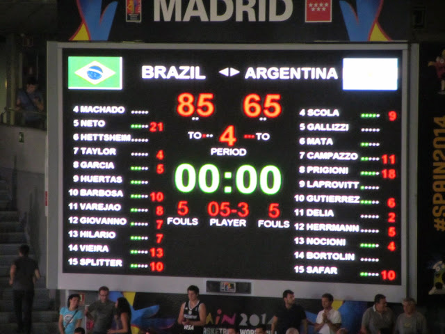 Но довольно лирики, вернемся к баскетболу. Южноамериканское дерби я уже, конечно, не мог пропустить, и пришел в зал минут за 10 до начала. Трибуны были заполнены, примерно около четверти всего зала были одеты в бело-голубое. Мне показалось, что на представлении команд аргентинцев приветствовали даже громче, чем испанцев накануне. Видимо, нейтральные испанские болельщики подтапливают за говорящих с ними на одном языке. Но и бразильцы не остались без поддержки. Тут и там мелькали желто-зеленые островки. Да и наверняка некоторые местные симпатизировали Уэртасу, Сплиттеру и прочим игрокам, играющим или игравшим в Ла Лиге. Уэртас, кстати, на разминке выглядел очень сосредоточенным.