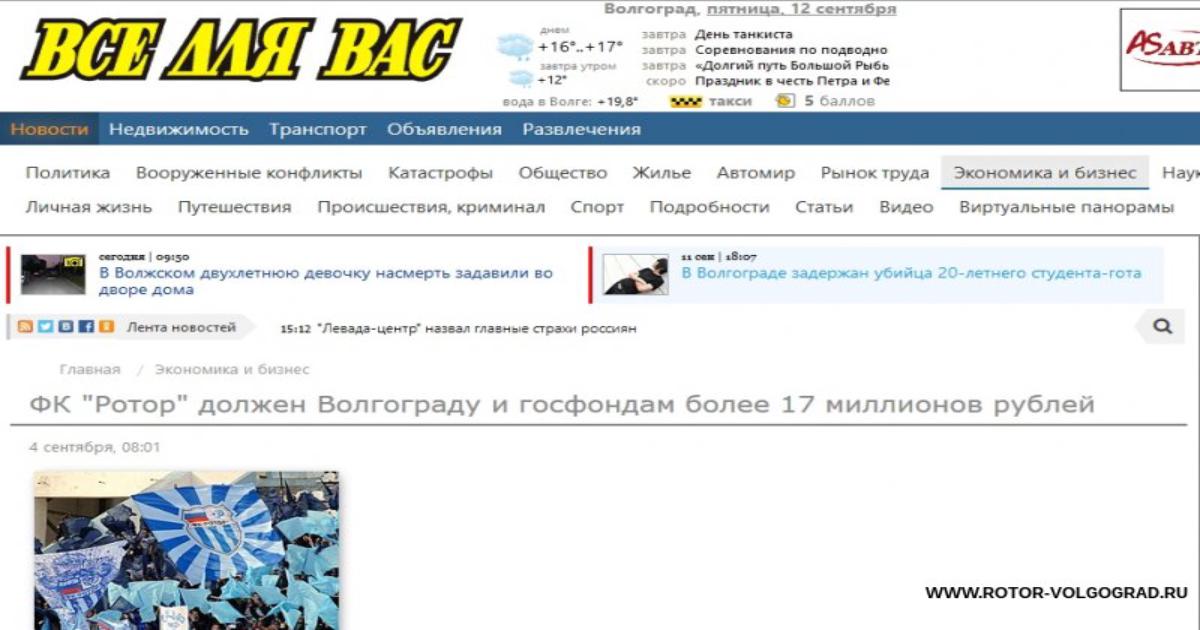 Кроме ФК "Ротор" в списке должников значится ФБУ «Подводречстрой» с суммой долга в размере 8,6 млн. рублей, а также ООО «Волгоградский завод оросительной техники и жилищно-коммунального хозяйства», задолжавший бюджету Волгограда 5,3 млн. рублей».