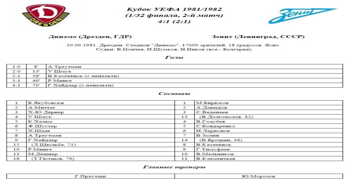 30 сентября 1981 года "Зенит" в Дрездене проводил ответный матч 1/32 финала Кубка УЕФА против местного "Динамо". Напомним, что это двухраундовое противостояние против немцев стало для "Зенита" первой еврокубковой баталией в истории, а, соответственно, матч в Дрездене - первым гостевым в еврокубках.К сожалению, первый блин вышел комом. Домашний матч зенитовцы проиграли со счетом 1-2, а ответной встрече потерпели разгромное поражение 4-1.