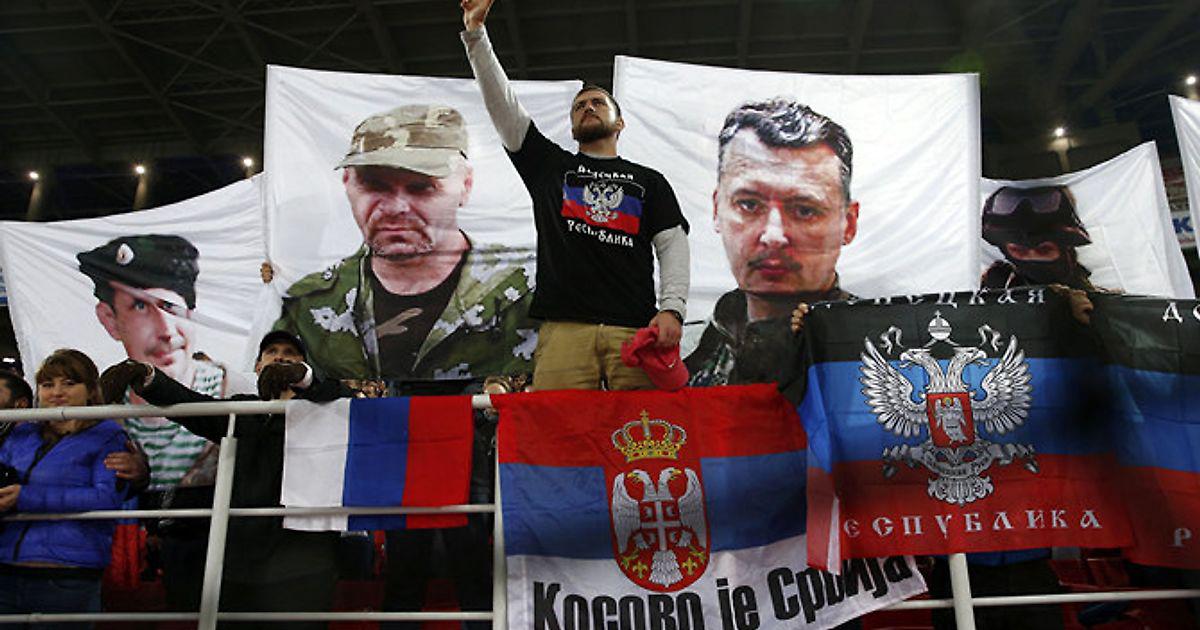 На баннерах – лидеры сепаратистов, которые ведут боевые действия на юго-востоке Украины в 2014 году.