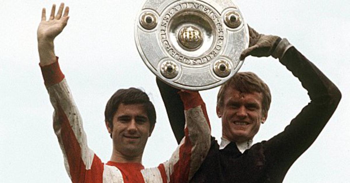 Сезон 1969/1970. Чемпионство достигло Менхенгладбаха. Вайсвайлер, нетцер и Фоггс представляют трофей.