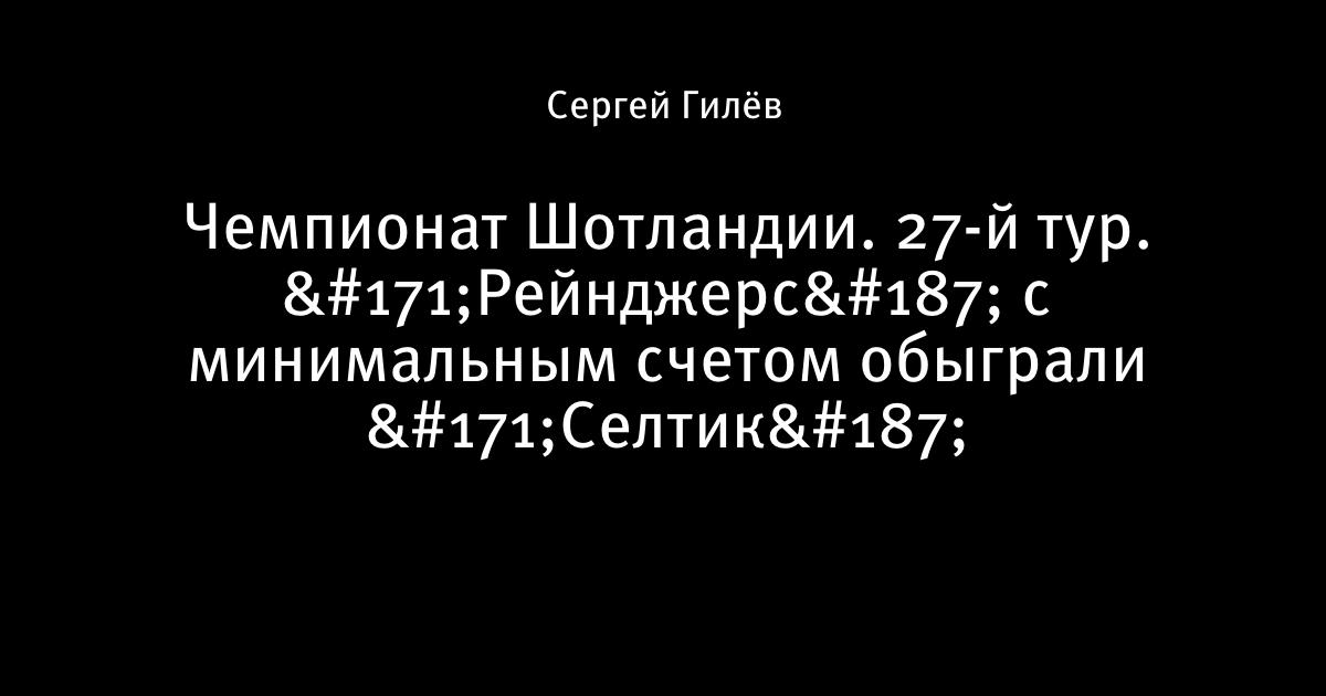 28 февраля 2010, 19:18 Чемпионат Шотландии. 27-й тур. «Рейнджерс» с минимальным счетом обыграли «Селтик» Рейнджерс  Селтик  1:0 1:0  Эду (90) Автор Сергей Гилёв Этот пост опубликован в блоге на Трибуне Sports.ru. Присоединяйтесь к крупнейшему сообществу спортивных болельщиков! Другие посты блога Разборки в олимпийском Париже