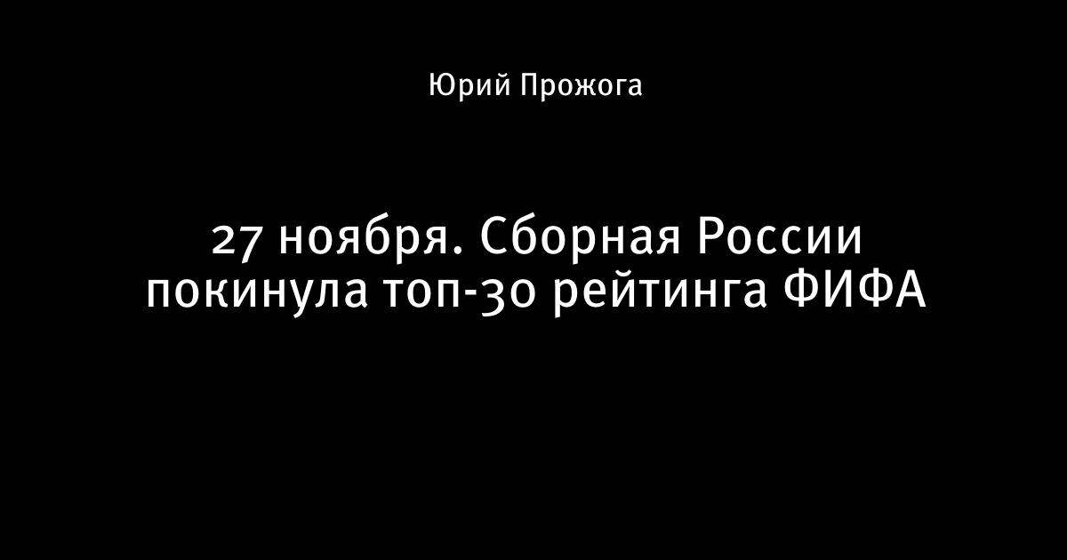 27 ноября 2014, 18:04 27 ноября. Сборная России покинула топ-30 рейтинга ФИФА Автор Юрий Прожога Этот пост опубликован в блоге на Трибуне Sports.ru. Присоединяйтесь к крупнейшему сообществу спортивных болельщиков! Другие посты блога Рисую спорт Сборная России по футболу ФИФА