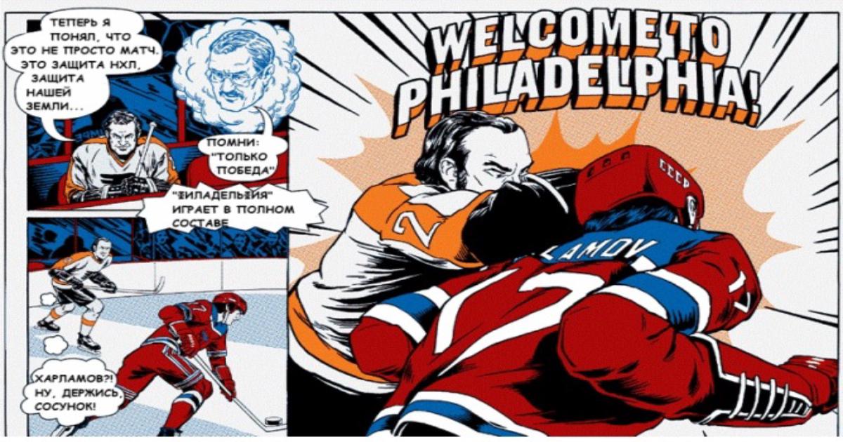 Ну а поводом к сегодняшнему обновлению стало совпадение. Совсем недавно у нас на главную выносился конкурсный пост с чемпионата хоккейных блогеров про Фреда Шеро и его "Филадельфию", изменившую хоккейный мир, и буквально тут же мне на глаза в Victory Journal попадается целый комикс о том же самом. В центре событий - знаменитый матч "Бандитов с Брод-стрит" против ЦСКА в январе 1976 года, да еще под любопытным углом зрения - с точки зрения главного "убийцы" Эда ван Импа!