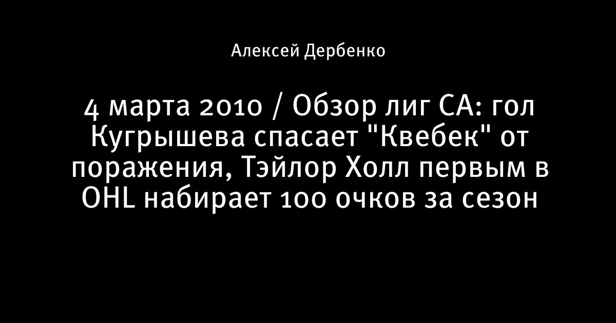 4 марта 2010 / Обзор лиг СА: гол Кугрышева спасает "Квебек" от поражения, Тэйлор Холл первым в OHL набирает 100 очков за сезон