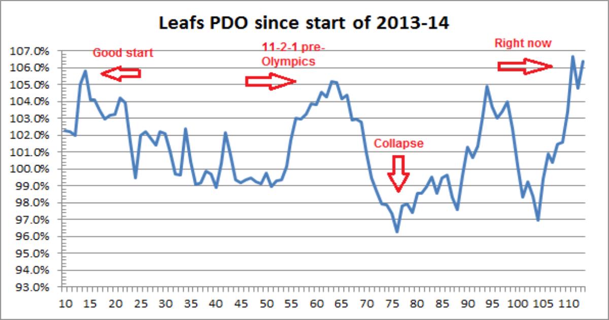 Коэффициент PDO (так же видел название как "удача") равен сумме коэффициентов наджености (то бишь коэф. надежности вратарей) и реализации бросков (отношение забитых шайб к общему числу нанесенных бросков). Довольно неплохо отражает динамику команды, её взлеты и падения. В среднем держится около 1.000.