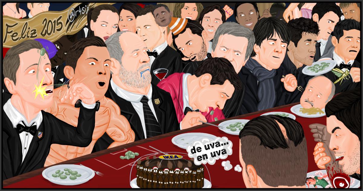 Участвуют: полуобнажённый Роналду, Месси в красном костюме, Суарес-каннибал и Симеоне, размышляющий о винограде