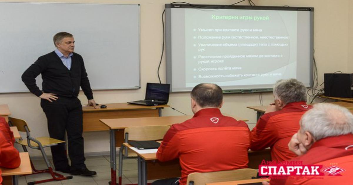 В понедельник в Академии состоялось семинарское занятие по правилам игры, которое для спартаковских тренеров провел преподаватель Межрегионального Центра по подготовке судей и инспекторов при Московской федерации футбола Владимир Енютин.