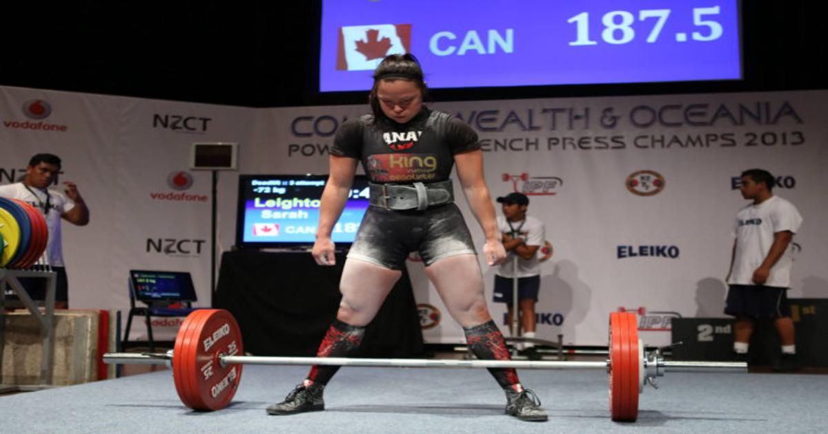 Саре Лейтон 35 лет и она занимается силовым троеборьем. С 2008 года она выступает на соревнованиях различного уровня и установила национальный рекорд Канады в весе 67,5 кг.