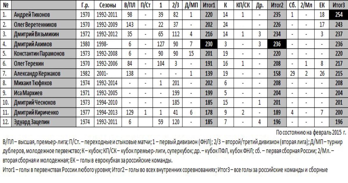 За несколько последних лет предпринимались некоторые шаги по составлению списка российских бомбардиров. К сожалению, сайт статистиков КЛИСФ приостановил свою работу, а меж тем там была предпринята первая подобная попытка http://www.klisf.info/stat/cl_rus_bomb.htm. Также нельзя не отметить работу блога RFS Underground https://www.sports.ru/football/blogs/525676.html по составлению "Клуба 200". Так что моя задача была во многом облегчена и оставалось только перепроверить данные и дополнить их несколькими другими любопытными цифрами. Таким образом получилась следующая картина: