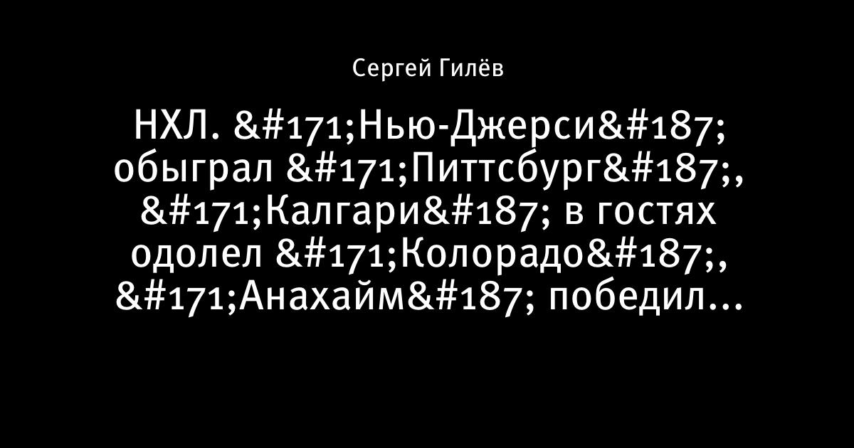 18 марта 2010, 12:47 НХЛ. «Нью-Джерси» обыграл «Питтсбург», «Калгари» в гостях одолел «Колорадо», «Анахайм» победил «Чикаго» Нью-Джерси Питтсбург 5:2 (2:1, 2:0, 1:1) Колорадо Калгари 2:3 (0:2, 1:1, 1:0) Анахайм Чикаго 4:2 (1:1, 1:0, 2:1) Автор Сергей Гилёв Этот пост опубликован в блоге на Трибуне Sports.ru. Присоединяйтесь к крупнейшему сообществу спортивных болельщиков! Другие посты блога Айс-ТВ