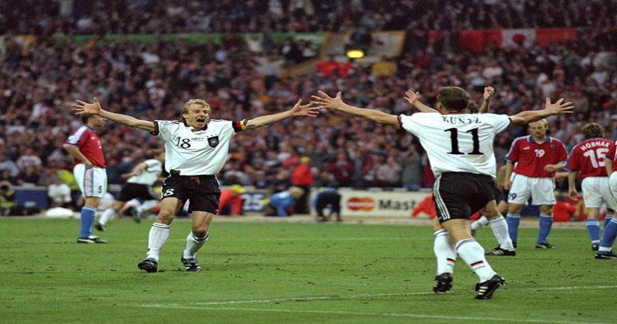 В составе сборной Чехии выступало немало молодых футболистов, открывших своей успешной игрой на турнире дверь в европейский футбол – Павел Недвед, Патрик Бергер, Владимир Шмицер, Карел Поборски. Команда показывала яркий напористый футбол и, действительно, заслужила место в финале. Решающий матч Евро прошел на высоких скоростях, чехи не собирались отсиживаться в обороне, успешно по обоих флангах полузащиты играл Поборски, часто цеплялся за мяч впереди «девятка» Павел Кука. В середине второго тайма сборная Чехии была вознаграждена за свою активность – Заммер нарушил правила в штрафной, а Бергер реализовал одиннадцатиметровый. Сравнял счет совсем недавно вышедший на замену Оливер Бирхофф, и результат 1:1 остался до конца основного времени. Прошло всего пять минут овертайма, как Бирхофф после рикошета забивает победный мяч, который стал первым «золотым голом» в истории финалов мировых и европейских первенств. 2:1. Юрген Клинсманн не скрывает слёз, а королева Англии Елизавета II с натянутой улыбкой вручает почетный кубок в руки капитана команды, в полуфинале обыгравшую ее подданных.