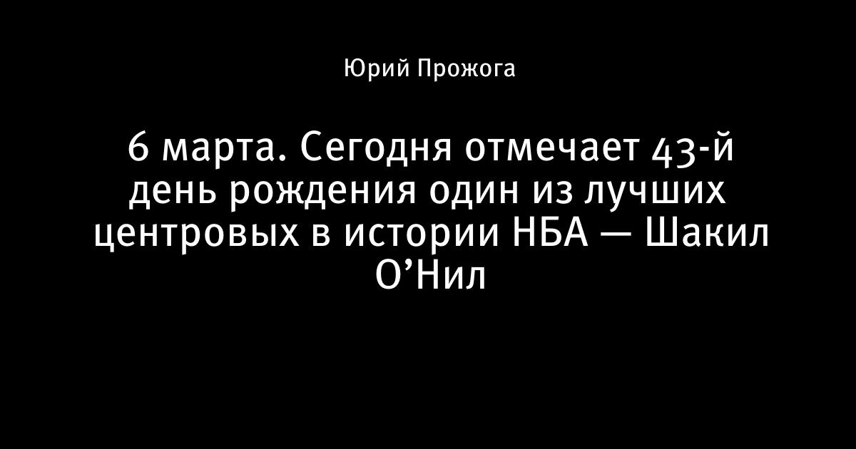 6 марта 2015, 21:38 6 марта. Сегодня отмечает 43-й день рождения один из лучших центровых в истории НБА — Шакил О’Нил Автор Юрий Прожога Этот пост опубликован в блоге на Трибуне Sports.ru. Присоединяйтесь к крупнейшему сообществу спортивных болельщиков! Другие посты блога Рисую спорт НБА Шакил О′Нил
