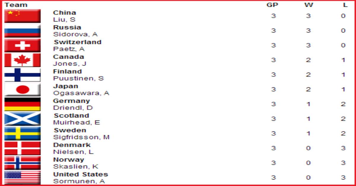 У Китая такая же ситуация, как и у наших - обыграли тех, кого должны были. Завтра игры с Канадой и Швейцарией, и лично я удивлюсь, если они хотя бы одну из них выиграют. А вот Швейцария все-таки уже обыграла Японию, которая совсем не подарок, как мы видим. Неплохой дебют молодой команды Алины Петц.